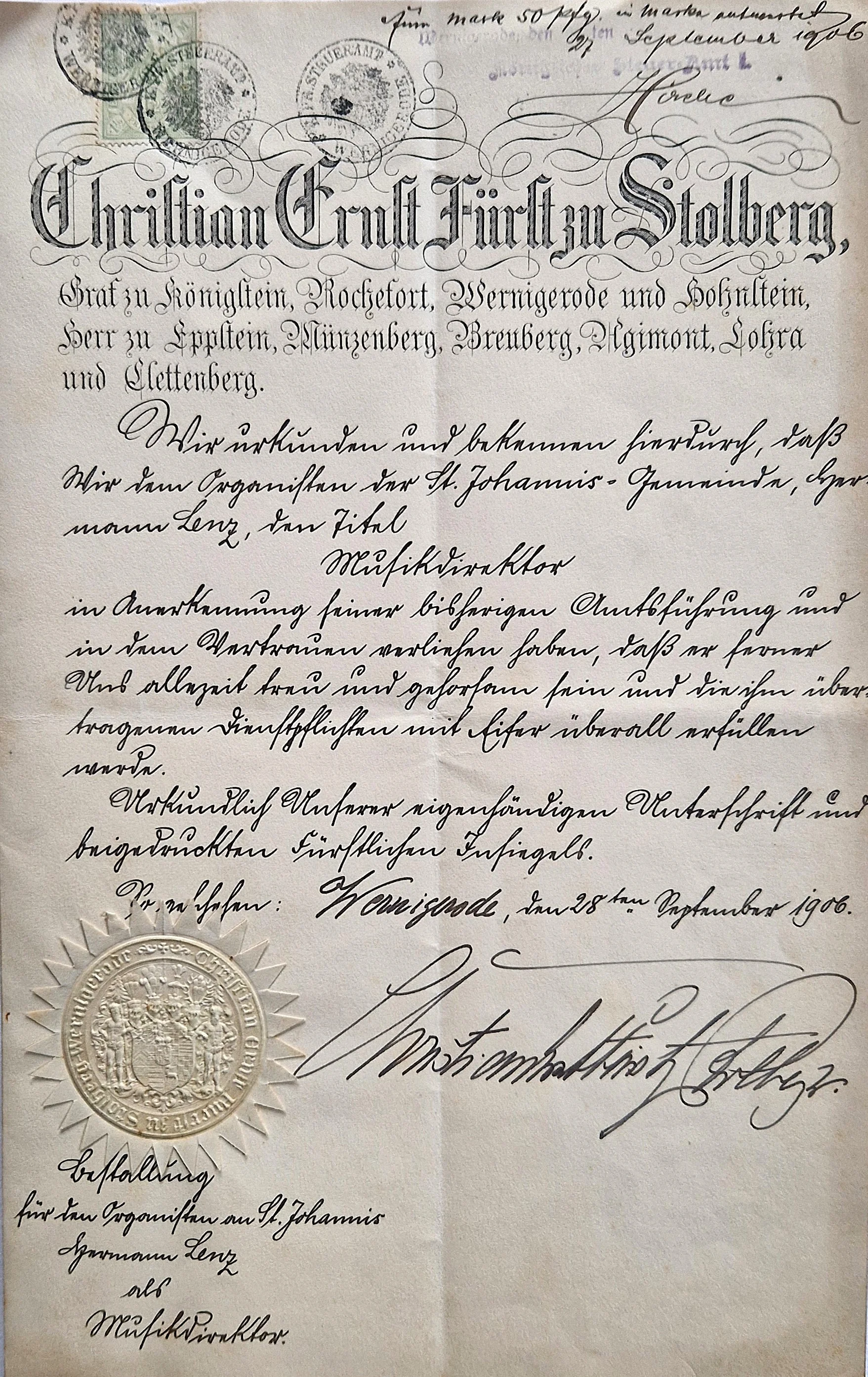 Christian Ernst Fürst zu Stolberg-Wernigerode: Urkunde zur Verleihung des Titels „Musikdirektor“ an den Organisten und Musiklehrer Hermann Lenz